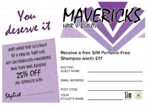 Our gift vouchers are available through out the year, if you wish to gift someone special a Maverick voucher. These vouchers can be used for all aspects of our business including Hair, Beauty and products. This hard credit sized plastic vouchers come in £5 or £10 denominations with an envelope.